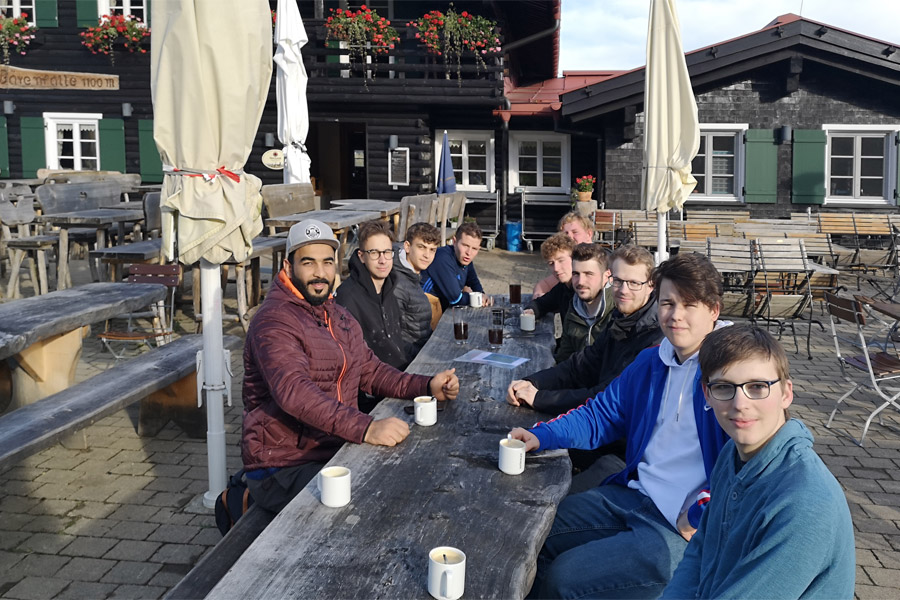 12:00 Uhr: Ziel „ Alpe Obere Kalle“ erreicht! Bei einem gemütlichen Mittagessen berichtet Vincent über seinen Azubi-Aufenthalt in Irland.